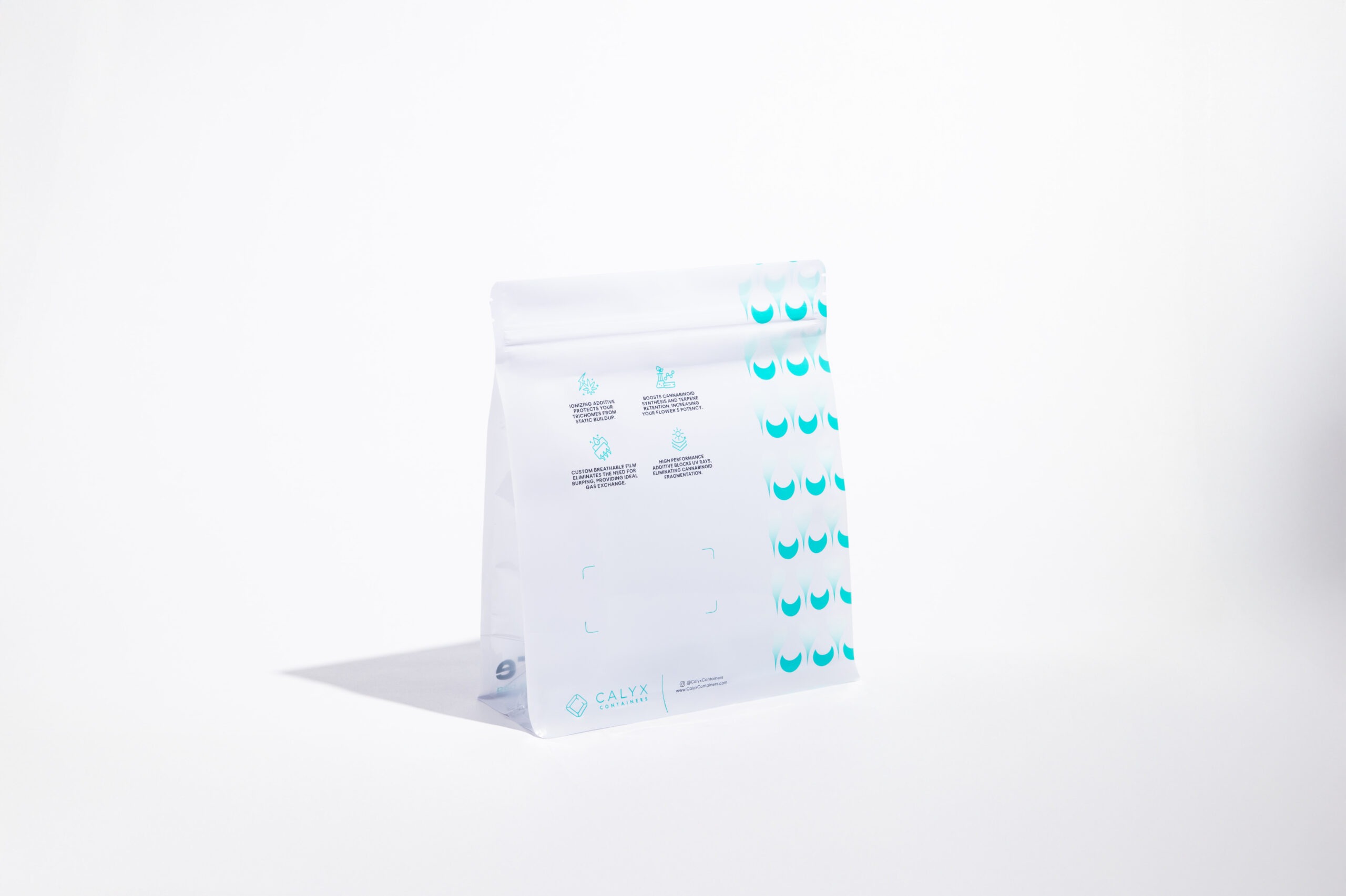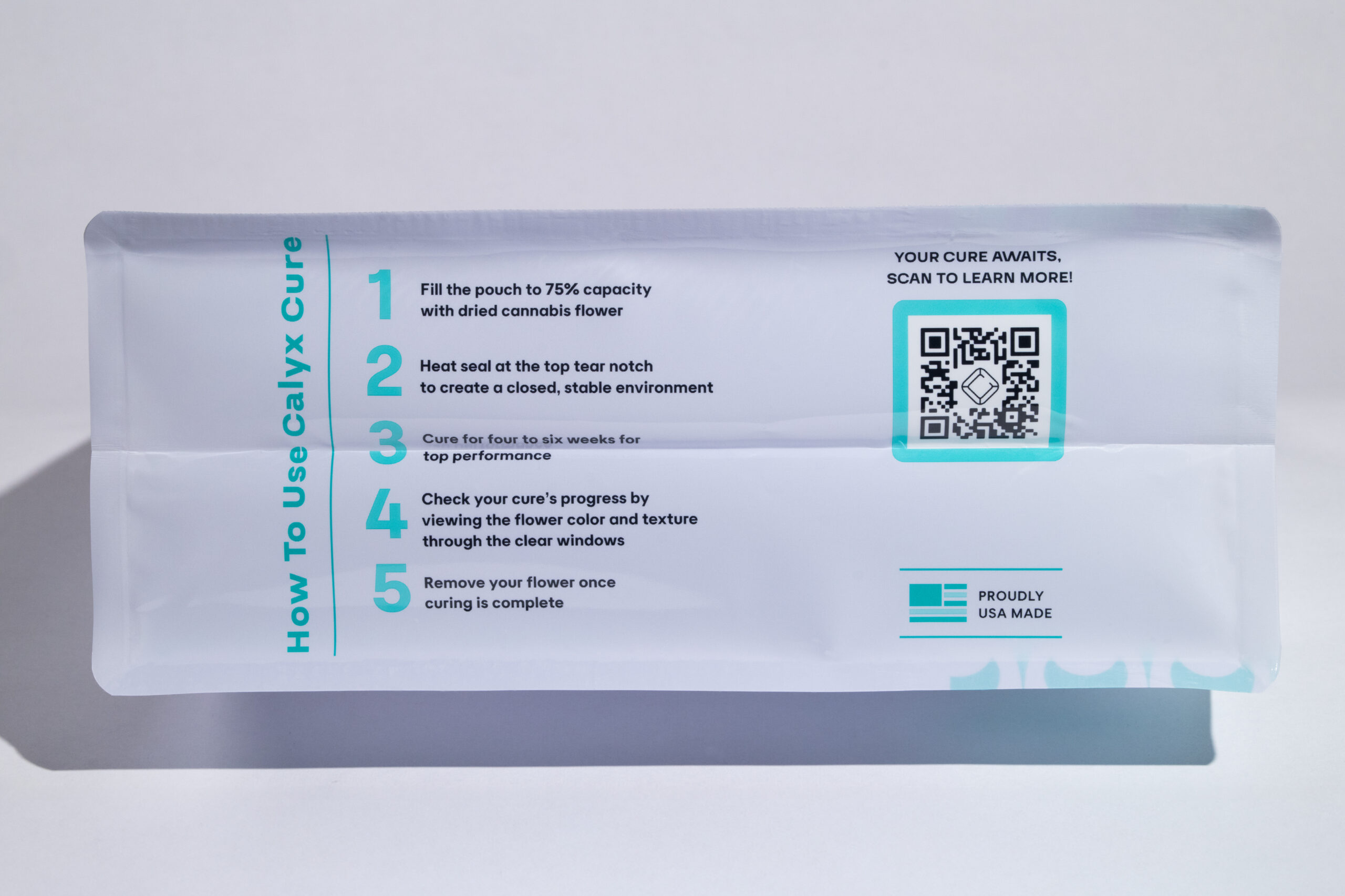 The 1 lb Calyx Cure cannabis curing bag is designed for small-batch cannabis curing with professional consistency. Using advanced gas-permeable packaging film technology, this flat-bottom, side-gusset pouch off-gasses CO₂, excess moisture, and VOCs, eliminating daily burping and humidity packs. Data-backed to improve terpene preservation, weight retention, and flower quality, the 1 lb size delivers craft-level curing results with durable odor protection, UV shielding, and anti-static performance.