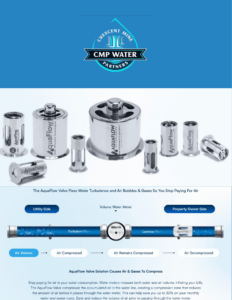 CMP Water, through its AquaFlow valve technology, helps businesses and property owners stop overpaying for water they never actually use. In most utility systems, air is naturally present in the water lines, and traditional water meters can’t distinguish between air and water volume—meaning you’re often charged for both. The CMP valve is engineered to remove air turbulence and compress air and entrained gases, so your meter measures true water flow, not inflated readings caused by air pockets and turbulence.